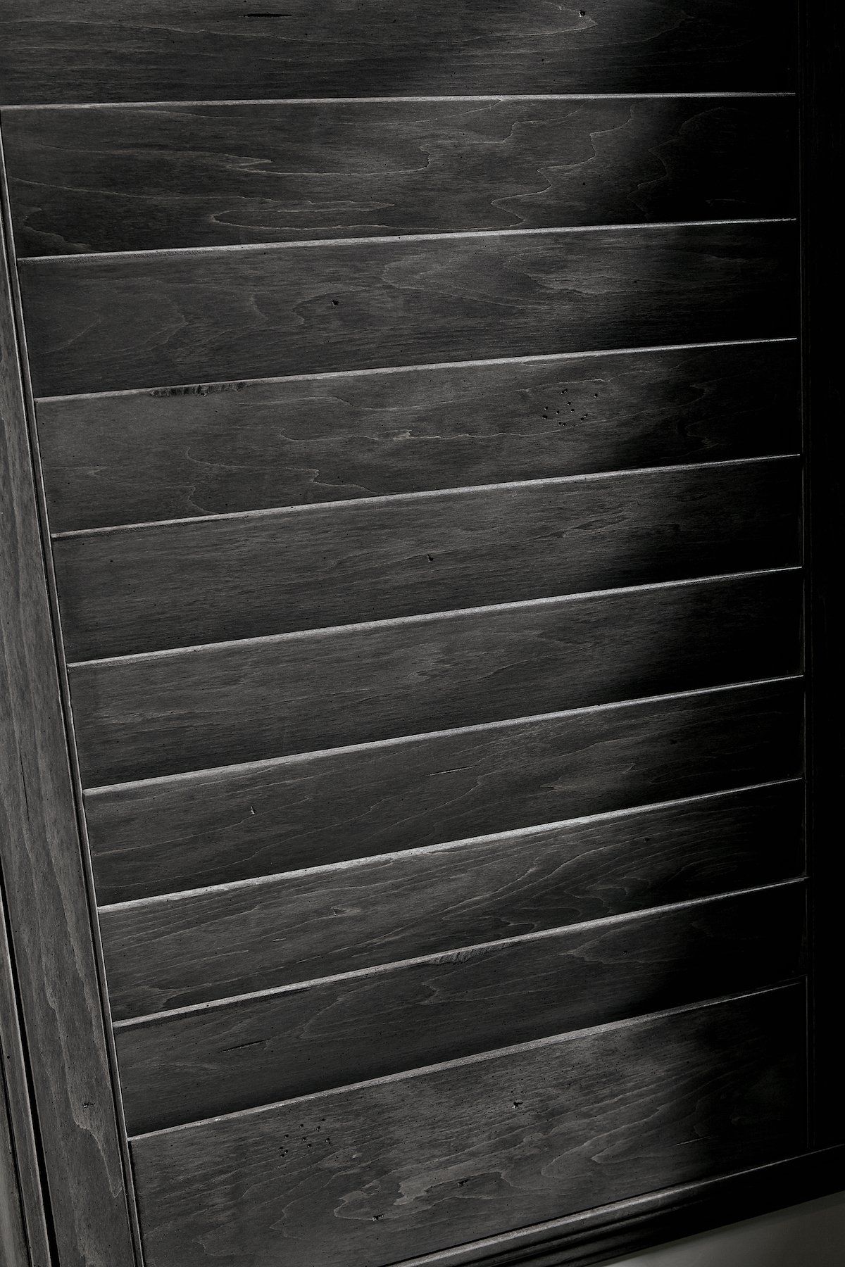 This technique plays up naturally occurring characteristics of hardwood by artistically arranging knots, pin holes, mineral streaks and growth rings for a one of a kind shutter.