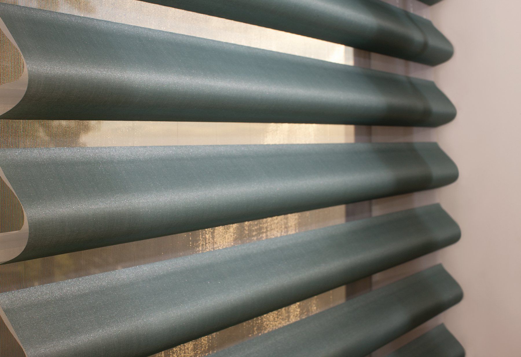 Soft horizontal fabric vanes that float on a sheer backing allow you to achieve infinite combinations of light control, view-through and privacy. The sheer fabric back panel diffuses sunlight, transforming it into a warm glow while filtering out UV rays.